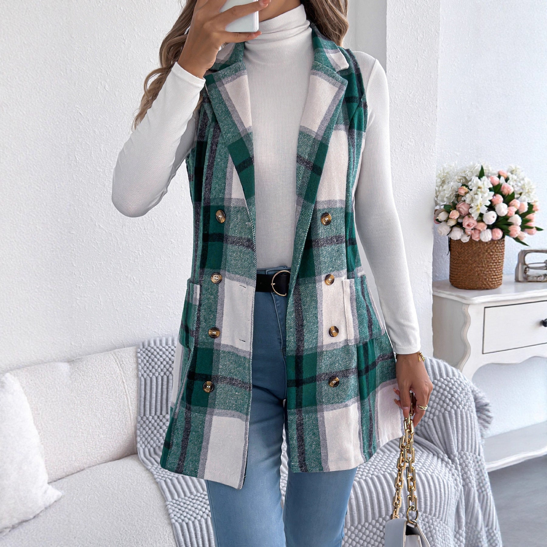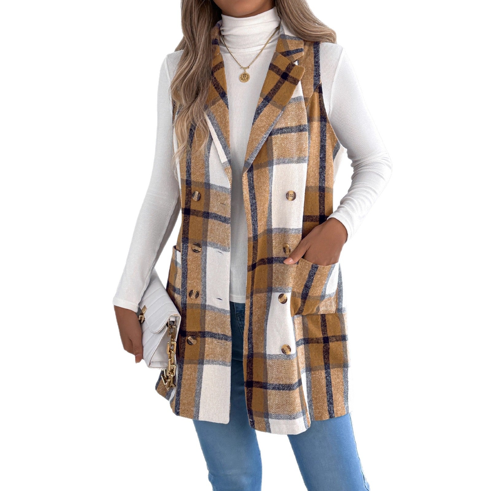 Double breasted pocket woolen coat long vest